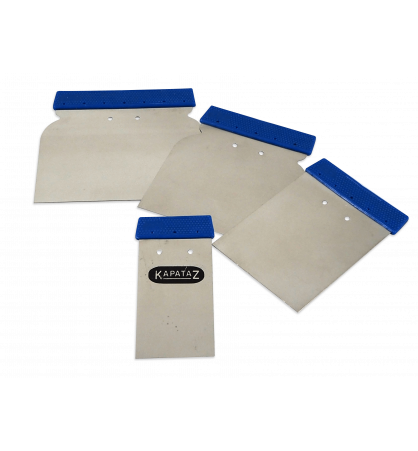 JUEGO DE ESPÁTULAS DE ACERO INOXIDABLE PARA CARROCERO Con hoja en acero inoxidable flexible y mango de plástico. El juego incluye una espátula de 5, 8, 10 y 12 cm.