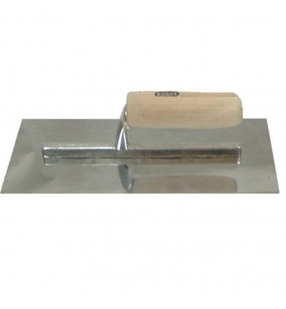 Llana yesero inoxidable con mango de madera abierto. Medidas: 28 x 12 cm