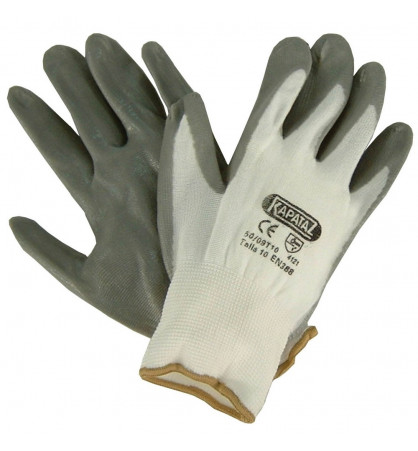 GUANTES NYLON CON NITRILO Guantes de tejido nylon con recubrimiento flexible de nitrilo. Ofrece buen agarre y gran dexteridad. Acabado liso. Cumple la normativa europea UE EN420:2003 + A1:2009 y EN388:2016. Resultados: 3121X. Disponible en talla 8, 9 y 10.